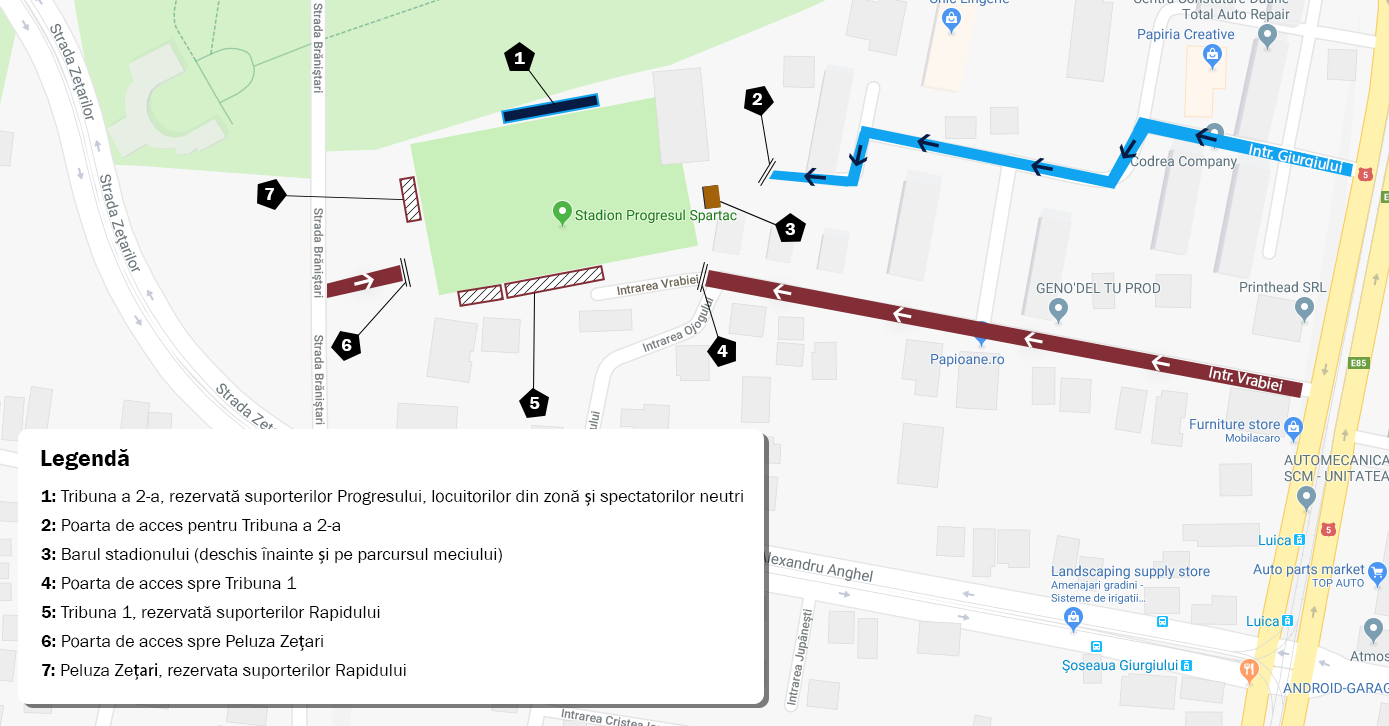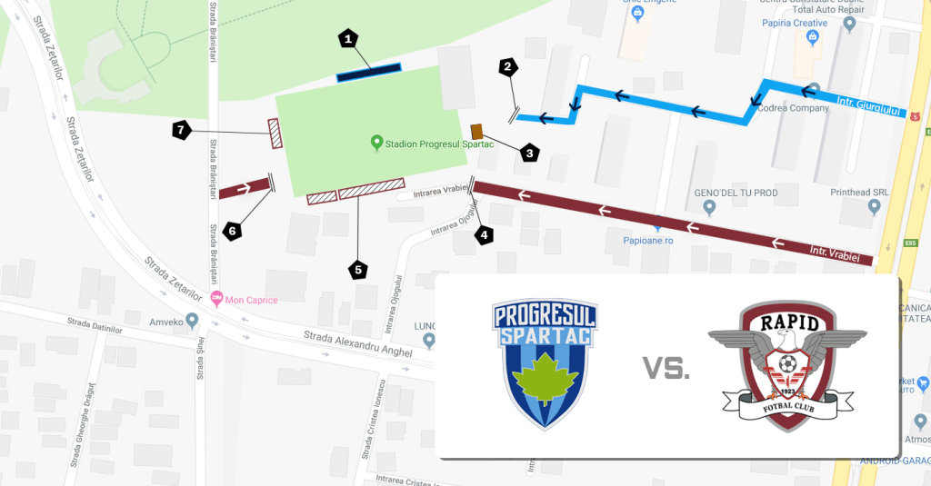 Clubul Progresul Spartac doreste sa permita accesul cat mai multor suporteri rapidisti la acest meci, cu respectarea reglementarilor oficiale, respectiv acces complet separat in stadion. Astfel, la Tribuna I si peluza vor intra suporterii rapidisti, in timp ce Tribuna a doua va fi rezervata suporterilor progresisti si spectatorilor neutri. Accesul se va face conform hartii din fotografie, astfel: